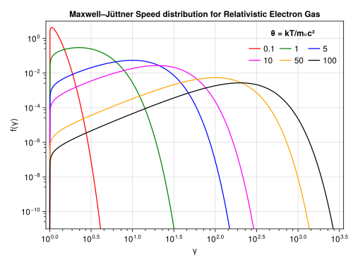$$ P_\mathrm{MJ}(\gamma)=\frac{\gamma^2\beta}{\Theta K_\mathrm{2}\left(1/\Theta\right)}\exp\left(-\frac{\gamma}{\Theta}\right)\, $$where $\gamma$ is relativistic Lorentz factor, $\beta=v/c$ is normalised velocity of an electron, and $K_\mathrm{2}$ is the modified Bessel function of the second kind. Lastly, $\Theta=k_\mathrm{B}T/(mc^2)$, where $T$ is the temperature of the gas, $k_\mathrm{B}$ is Boltzmann constant, $m$ is the electron mass, and $c$ is the speed of light. The parameter $\Theta$ represents the ratio of kinetic and rest energy of the electron and indicates how relativistic the electron speed distribution is. If MJ distribution~\ref{eqa:MJ} is evaluated in normalised speed $\beta$ it’s support is limited to an interval $\left[0,1\right[$. It describes the probability of finding a particle in a hot gas (at temperature $T$) with specific momentum $\textbf{u}$.